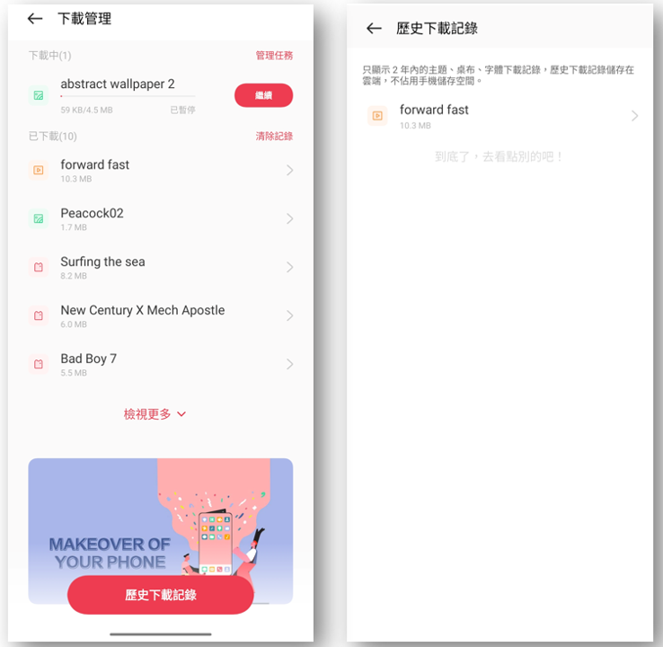 • [下載管理] :該設備主題商店的資源下載記錄,裡面的 [歷史下載記錄] 可展示該賬號在任何設備的資源下載記錄。如更換設備後可在此處重新找到並下載歷史資源;