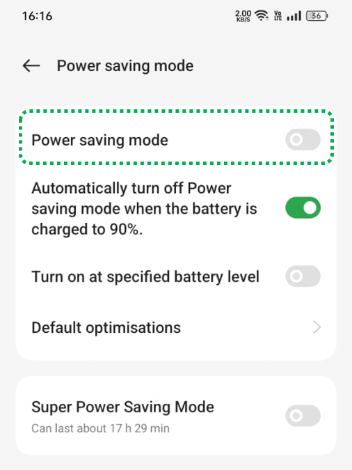 Open [Settings] > Click on [Battery] > Click on [Power Saving Mode] > Turn off [Power Saving Mode], or you can pull down the status bar to turn it off.