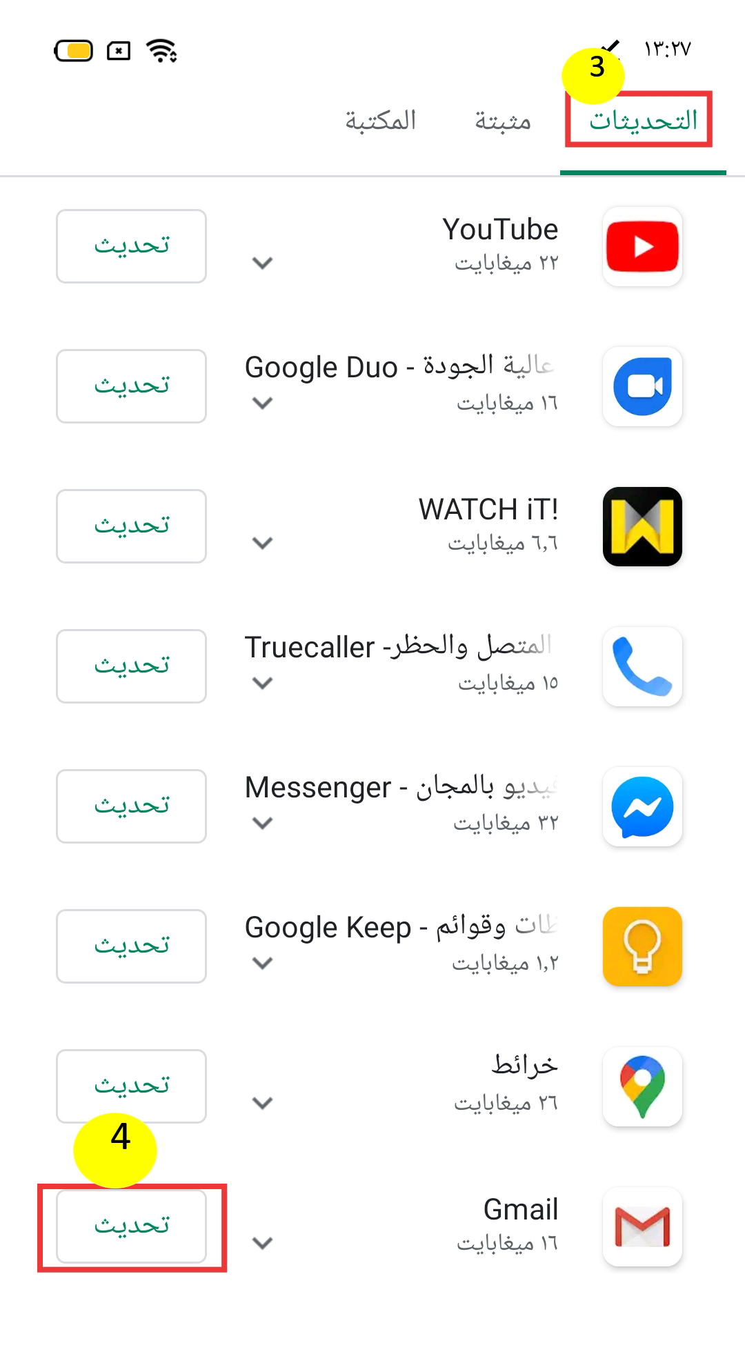 وانقر على [تطبيقاتي وألعابي]. في علامة التبويب [التحديثات] ، حدد موقع تطبيق البريد الإلكتروني وانقر على [تحديث].