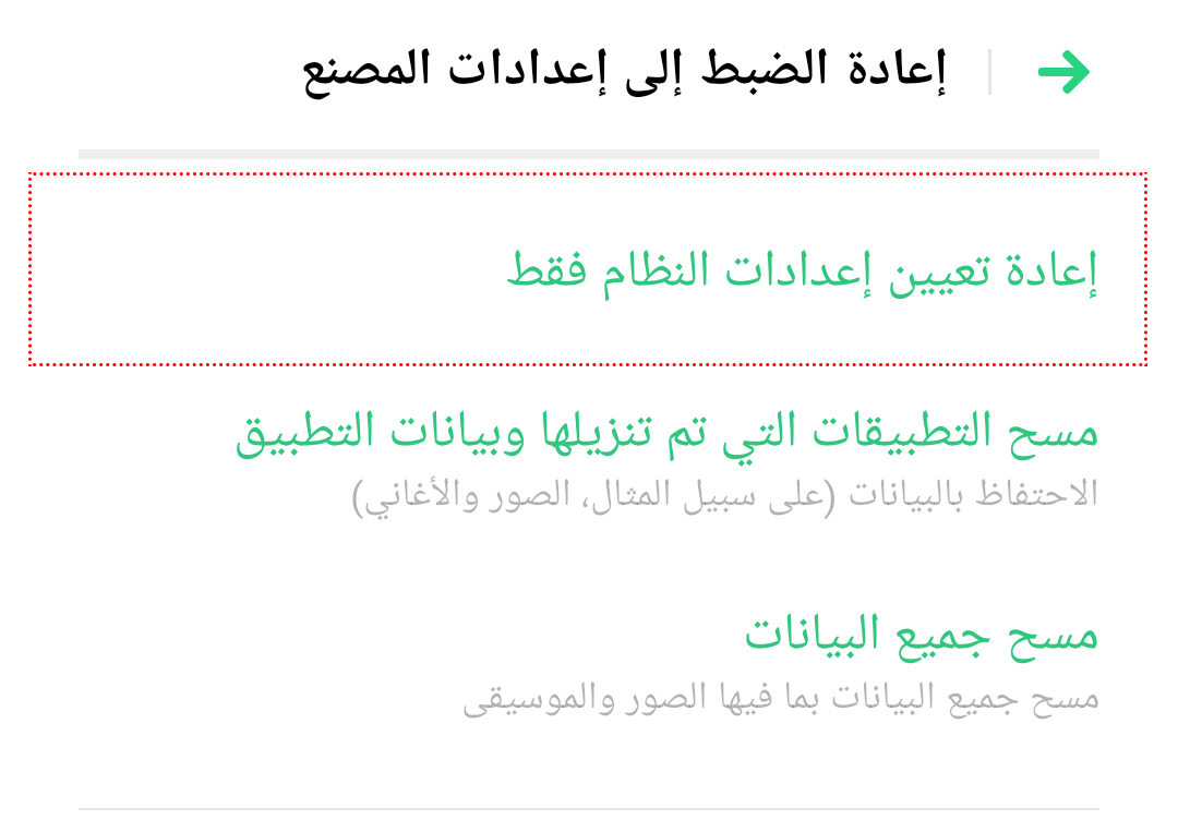4.النسخ الاحتياطي وإعادة ضبط إعدادات النظام. انتقل إلى [الإعدادات]> [إعدادات إضافية]> [النسخ الاحتياطي وإعادة التعيين]> [إعادة الضبط إلى إعدادات المصنع]> [إعادة تعيين إعدادات النظام فقط] وأدخل كلمة مرور شاشة القفل للتأكيد. تأكد من أنه لن يتم حذف ملفات البيانات أو الوسائط الخاصة بك.