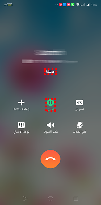 . زر التعليق يتحول للون الأخضر مع ظهور رسالة 'معلقة' على الشاشة عند تعليق المكالمة.