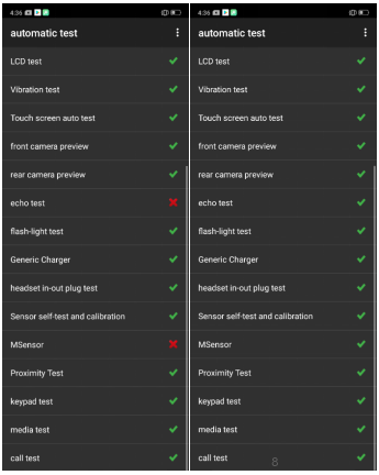 | 11 | M-Sensor စမ္းသပ္မႈ | ဖုန္းကိုဘယ္ဘက္မွညာဘက္သို႔လႈပ္ပါ။ အကယ္၍ interface သည္“ PASS” ကိုျပၿပီးေနာက္ထပ္စမ္းသပ္မႈသို႔ခုန္လွ်င္၊ ၎သည္ ေကာင္းသည္။ |