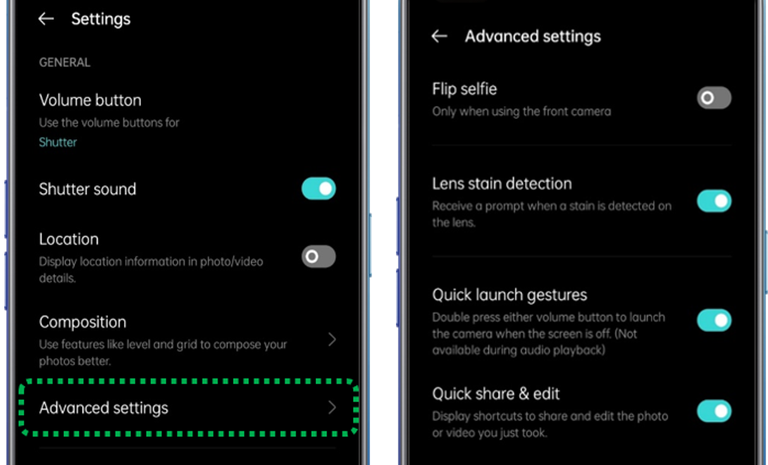 Note: With ColorOS 12 and above device all the settings can be seen in Camera settings only instead of advanced settings.