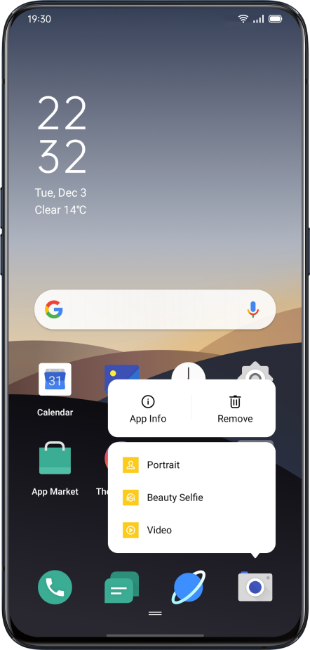 After enabling the App Shortcuts mode, press and hold the app icon to create an icon. Tap the icon you would like to use, then the app will open directly to that feature. For example, go to your Home screen and press and hold on the icon of Camera that lets you jump straight to portrait shooting, Beauty Selfie, Video Recording, or the App Info page.
