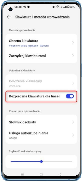 Przejdź do Ustawienia > Ustawienia dodatkowe > Klawiatura i metoda wprowadzania, i włącz „Bezpieczna klawiatura dla haseł”.