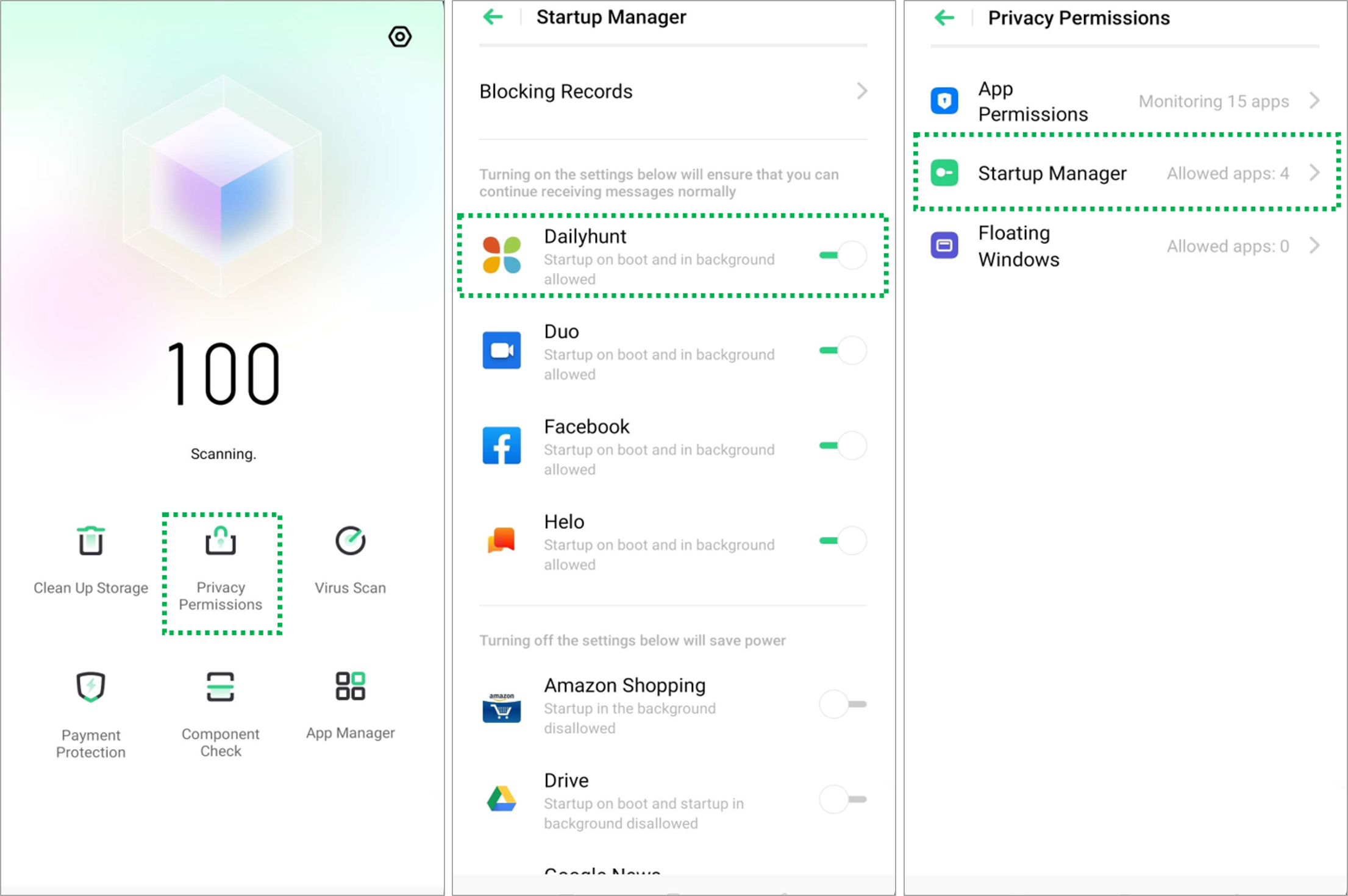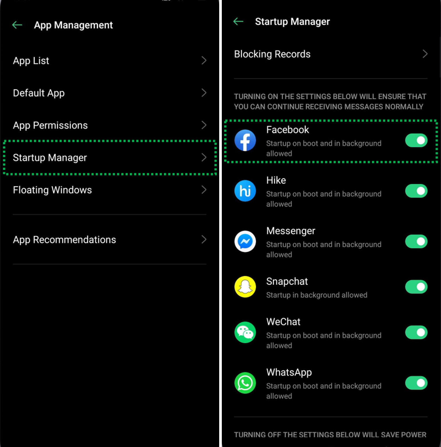 Go to [Settings] > [Phone Manager] > [Privacy Permissions] > [Startup Manager] > Turn off the green toggle of the app to grey to block it from starting at bootup time.