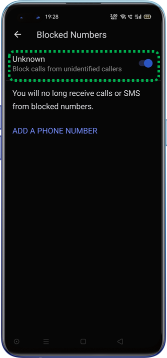 Open [Contacts] > [] > [Settings] > [Blocked Numbers] > Enable [Unknown] to block all calls and texts from unidentified callers. You can also add a number by choosing [ADD A NUMBER] > [Enter Phone Number] > [Block].
