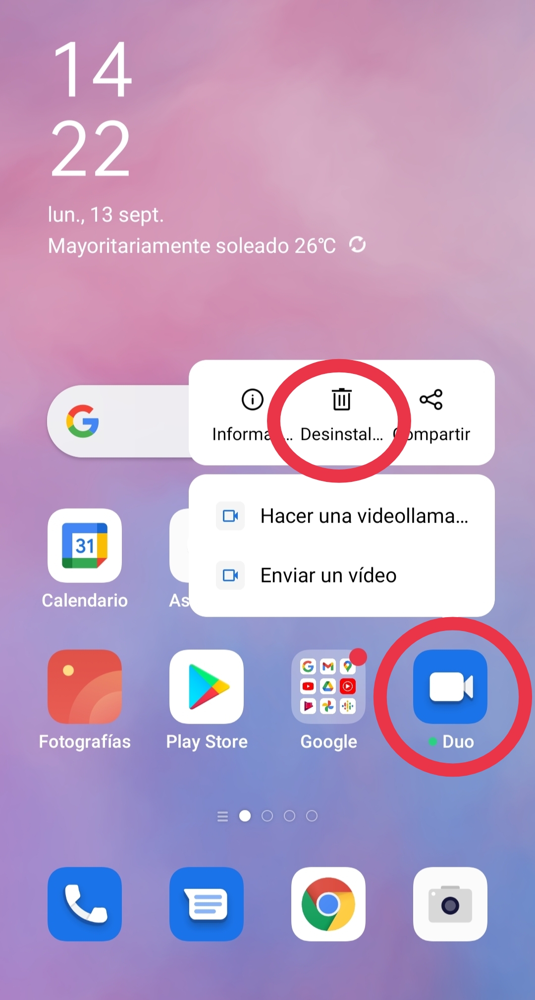 Elija cualquier aplicación que desee desinstalar desde la pantalla de inicio, a continuación, mantenga pulsado el icono de la aplicación y se le mostrará la opción de desinstalarla, haga click sobre [Desinstalar] y la aplicación se eliminará del teléfono. Estas instrucciones son válidas siempre y cuando el Modo de la pantalla de inicio esté configurado en Modo estandar o Modo simple. En caso de tener activado el Modo cajón, los pasos son los mismos, pero deberá mantener pulsado el icono desde el cajón de aplicaciones en lugar de hacerlo desde la pantalla de inicio.