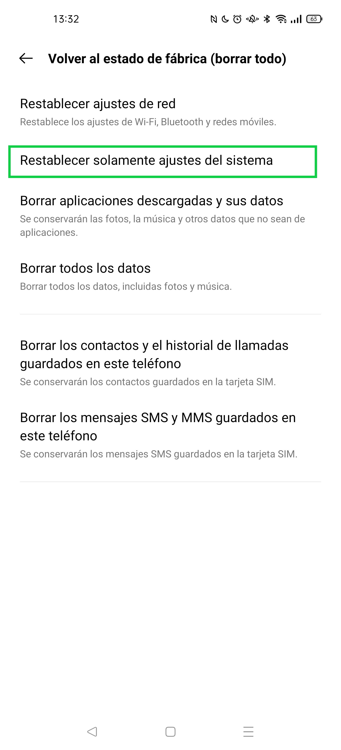 Vaya a [Ajustes] > [Configuración adicional] > [Hacer copia de seguridad y restablecer] > [Volver al estado de fábrica (borrar todo)] > [Restablecer solamente ajustes del sistema]
