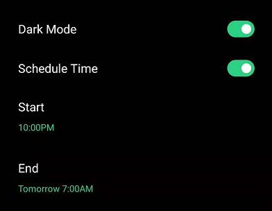 To schedule Dark Mode on your device, go to [Settings] > [Display & Brightness] > [Dark Mode] > toggle [Schedule Time] then manage the Start and End time.