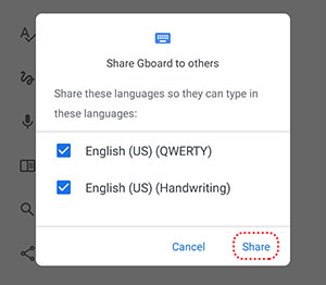 Yes. On the keyboard, tap the Settings icon > [Share Gboard] > choose the languages and tap [Share]. Alternatively, on the home screen, tap [Settings] > [Additional Settings] > [Keyboard & Input Method] > [Gboard] > [Share Gboard].