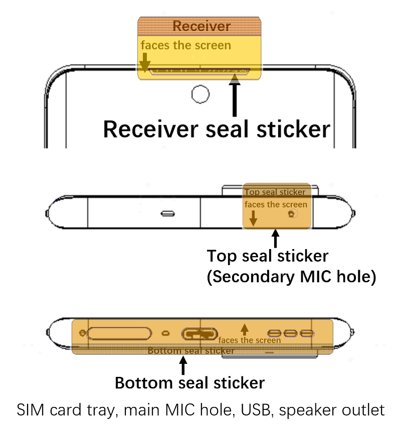 The body holes include the receiver, power button, volume keys, speaker hole, SIM card tray, primary MIC hole, and secondary MIC hole; the specific location can be seen in the lamination position schematic below.