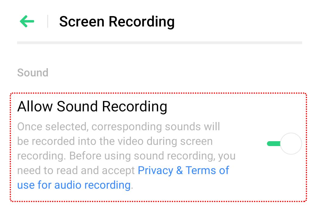 In some devices, you may need to go to [Settings] > [System Apps] > [Screen Recording] and toggle on [Allow Sound Recording].