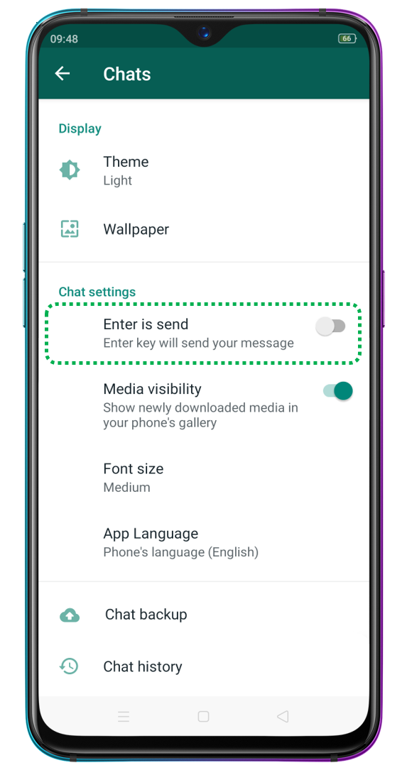 Open [WhatsApp] > Tap [] > [Settings] > [Chats] > Enable/ Disable [Enter is Send].