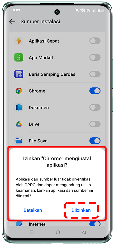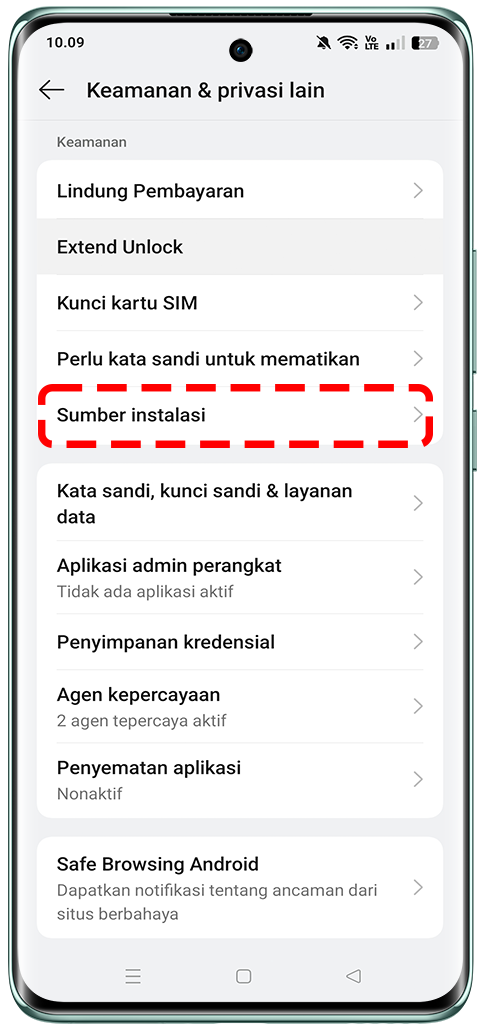 Masuk ke [Pengaturan] > [Keamanan & privasi ] > [Keamanan & privasi lain] > [Sumber instalasi] > aktifkan aplikasi pilihan kamu yang menjadi sumber instalasi, dan akan muncul prompt perizinan aplikasi lalu pilih [Diizinkan].