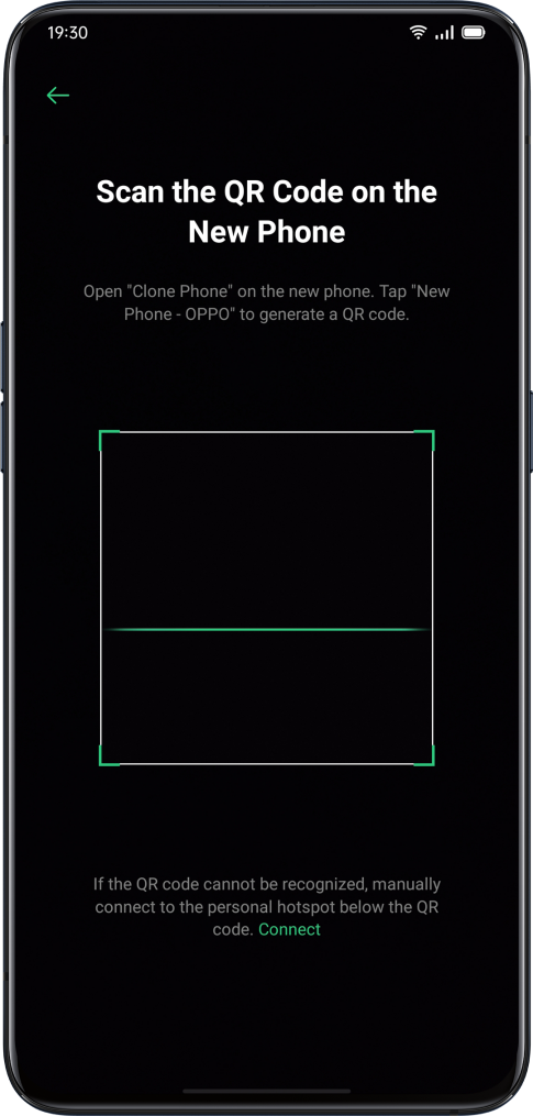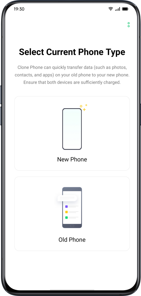 The old phone needs to install a "Clone Phone". Be aware that both devices are sufficiently charged. If the old phone does not install the Clone Phone app, tap https://i.clonephone.coloros.com/download to install.