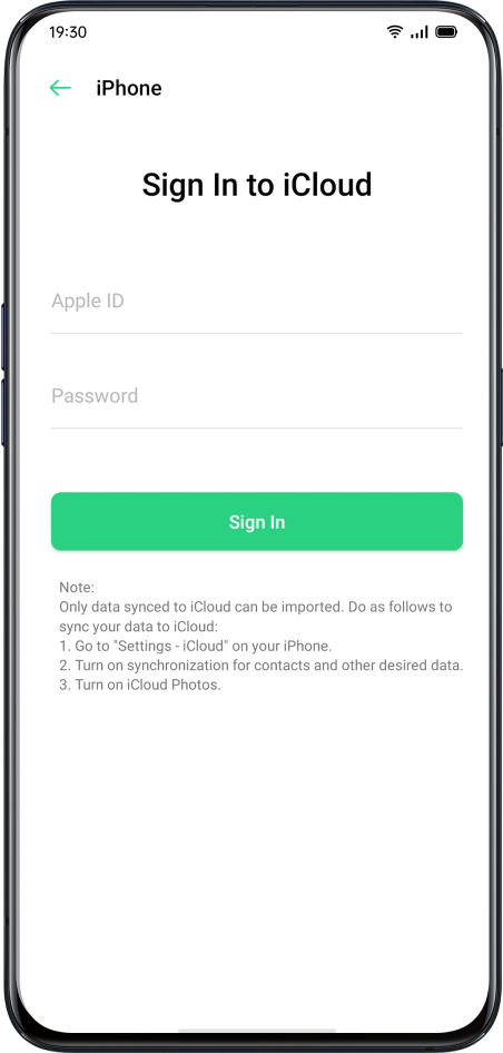To import data from an iPhone, firstly, you’ll need to sync the data to iCloud. Tap "Import from an iPhone" in the "Clone Phone" app, log in to the iCloud account of the iPhone to import data.