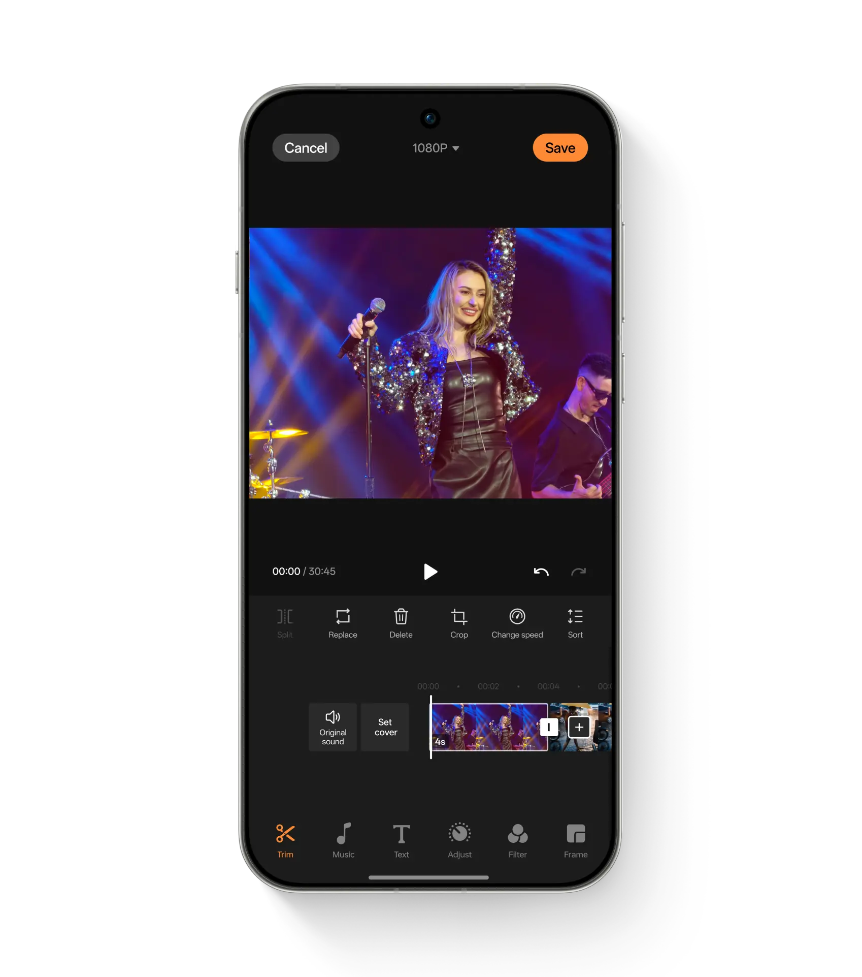 Clip: performs operations such as splitting, replacing, cropping, rotating, and adjusting the speed of the video.