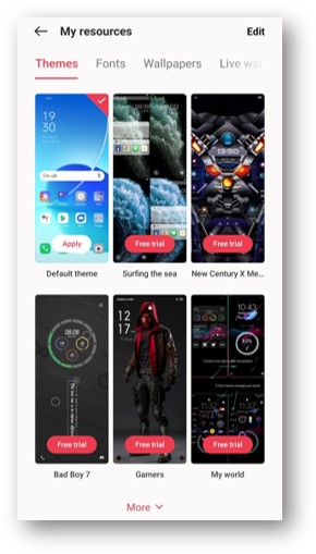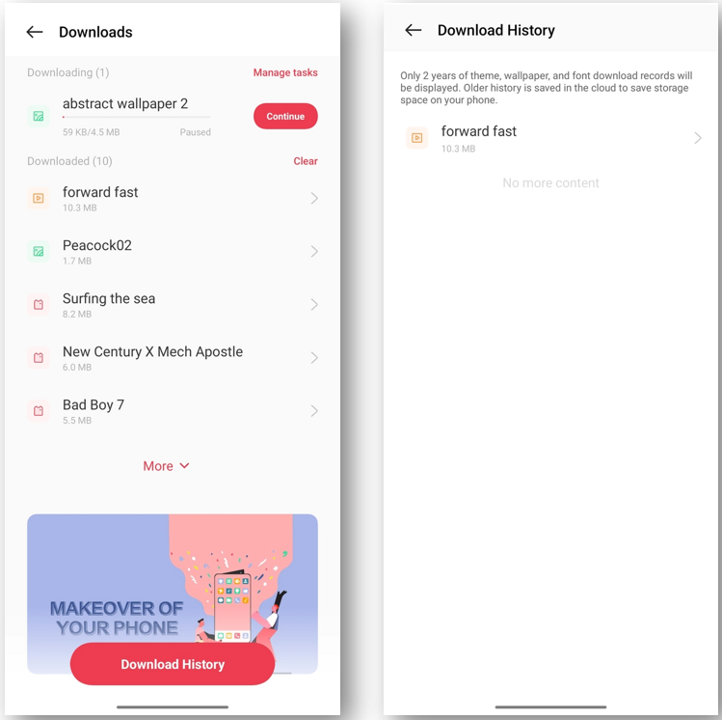 • [Downloads] :the resources downloaded records of one mobile phone. You can also check the downloaded records of one HeyTap account via [Download history] , even you change mobile phone, you can also apply the resources you ever used.