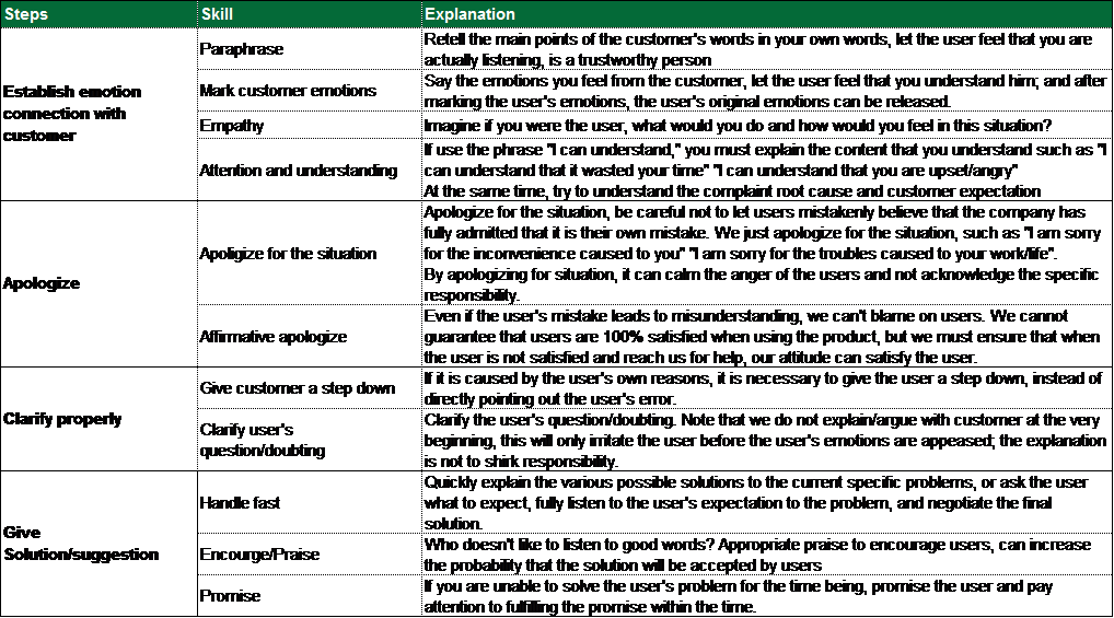Usually a good script that can appease customer consists with the following parts. (Note: The effect of the words is based on the sincere language and service attitude of the service staff.)
