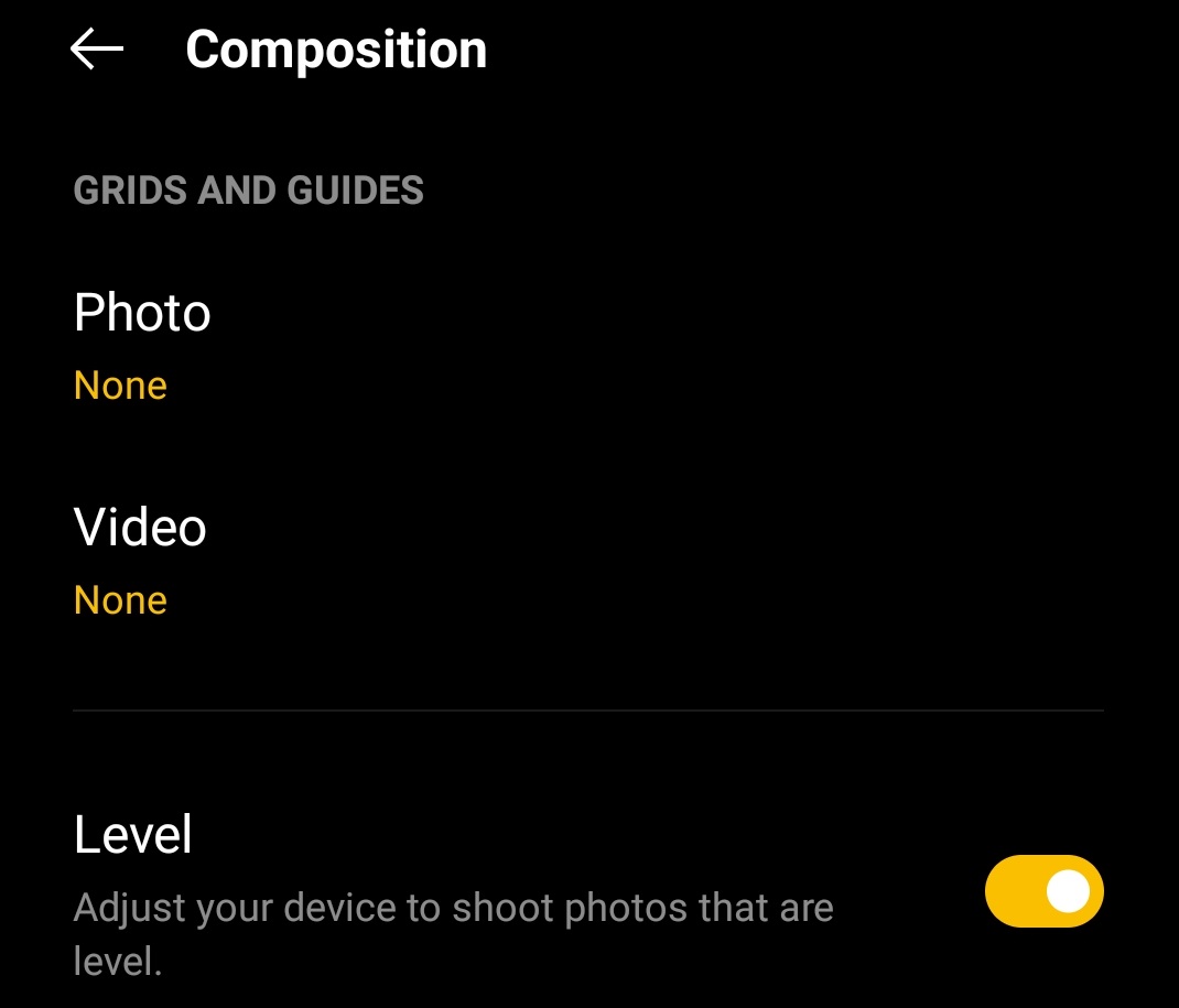 Level: The level feature lets you know if your device is in perfect alignment with your subject. This feature won't appear when you point your device at most of the objects. It will only appear when your camera is pointed directly up or down.
