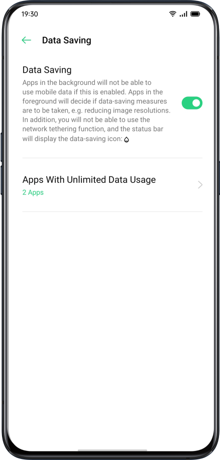 When "Data Saving" is on, apps in the background will not be able to use mobile data. Application in the foreground will decide if data-saving measures are to be taken, e.g. reducing image resolutions. In addition, you will not be able to use the network tethering function, and the status bar will display the data saving icon.