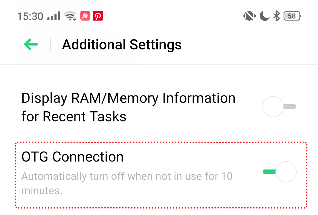 To turn on OTG on your phone, go to [Settings] > [Additional Settings] and toggle on [OTG Connection].