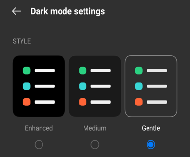 Go to [Settings] > [Display & Brightness] > Select [Dark] > [Dark Mode Settings] > You can choose from the three different contrast levels i.e Enhanced, Medium, and Gentle.