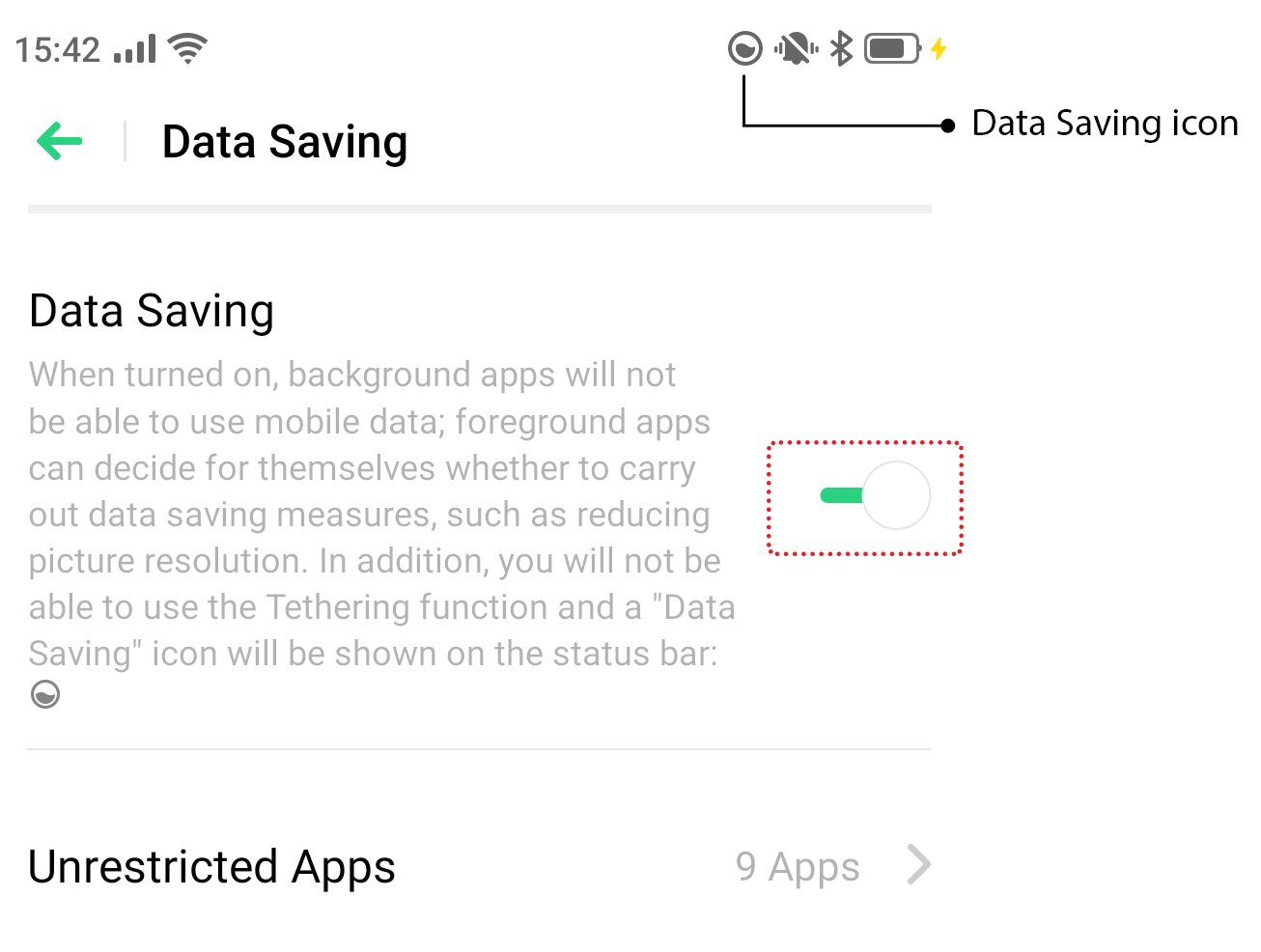 When Data Saving is turned on, background apps will not receive new messages and notifications except for the unrestricted apps. Tethering function will also be disabled.