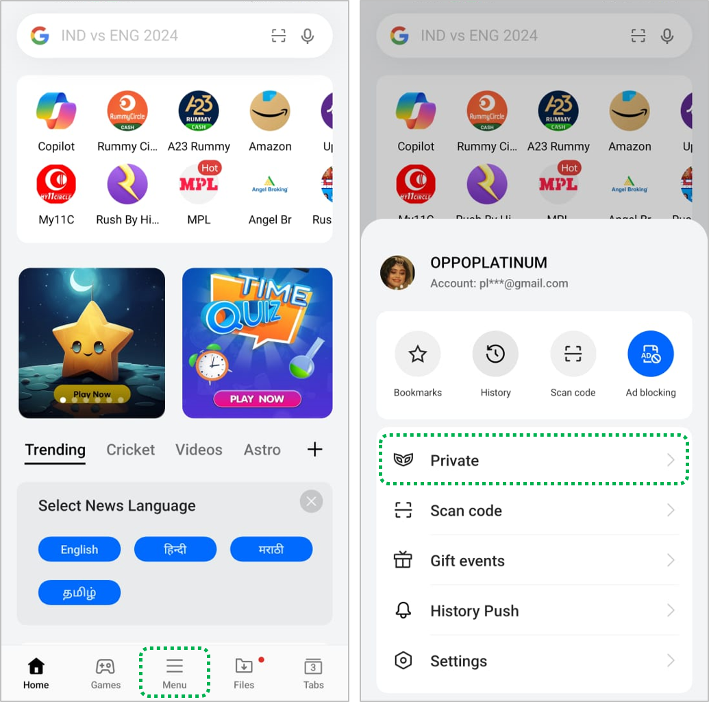 Open [OPPO Browser] > Tap [ ] > Enable [Private Browsing]. After enabling, open a new tab. There, you will see a restricted footprint icon at the bottom left corner. This will remind you that traceless browsing is enabled.