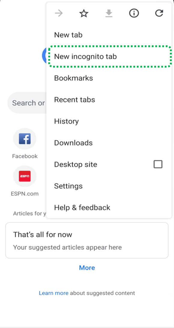 Open [Chrome] > [] > [New incognito Tab] > New tab will be opened and you can start browsing in incognito mode.