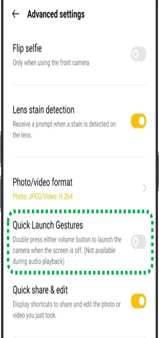 Open [Camera] > [] > [Settings] > [Advanced Settings] > Enable [Quick Launch Gestures].
