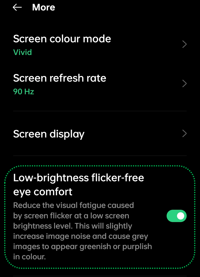 Go to [Settings] > [Display & Brightness] > [More] > Enable [Low brightness flicker-free eye comfort] / [Eye protect].