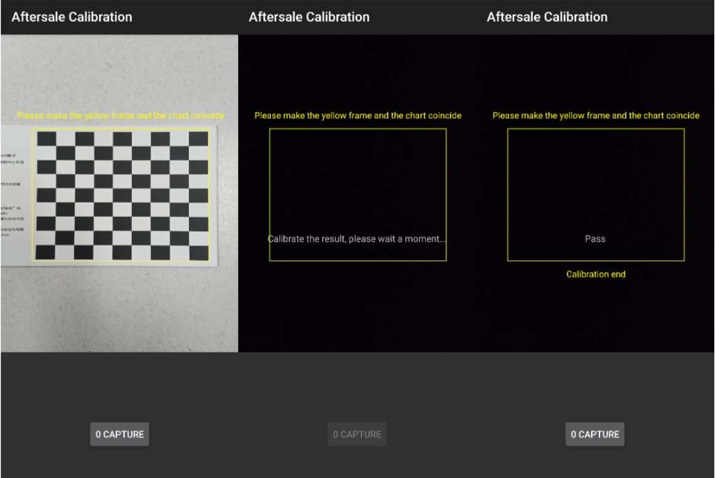 | 21 | Aftersale calibration | Please make the yellow frame and the chart coincide ,and take a photo ,calibrate the result , please wait a moment ,if calibrate success, will display pass ,calibrate complete |