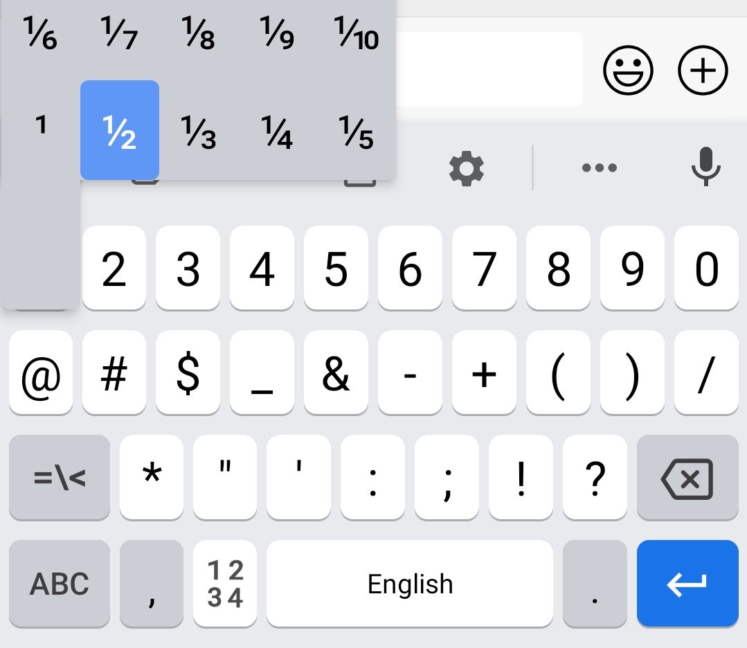 To type a superscript or fraction of a number, long-press the number in your Gboard. A pop-up menu will show you the superscript of the long-pressed number and a list of common fractions that use the long-pressed number as a numerator. For example, long-pressing the number 1 will display options like ½ and ¼.