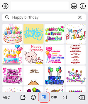 Create a new message or send one, then tap on the text area, and on your keyboard, tap the [Sticker] or the [GIF] icon.