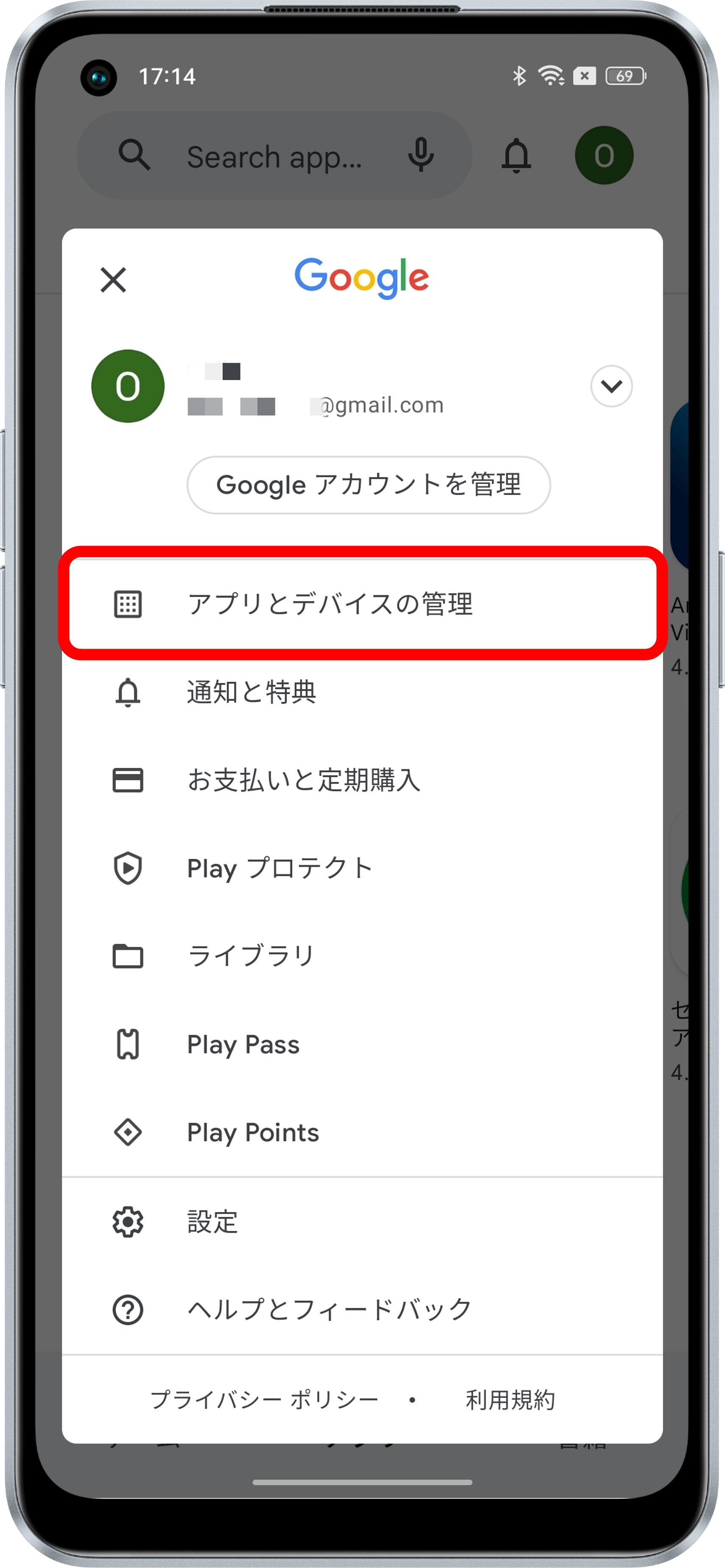 右上のプロフィールアイコンをタップして[アプリとデバイスの管理]を選択します。