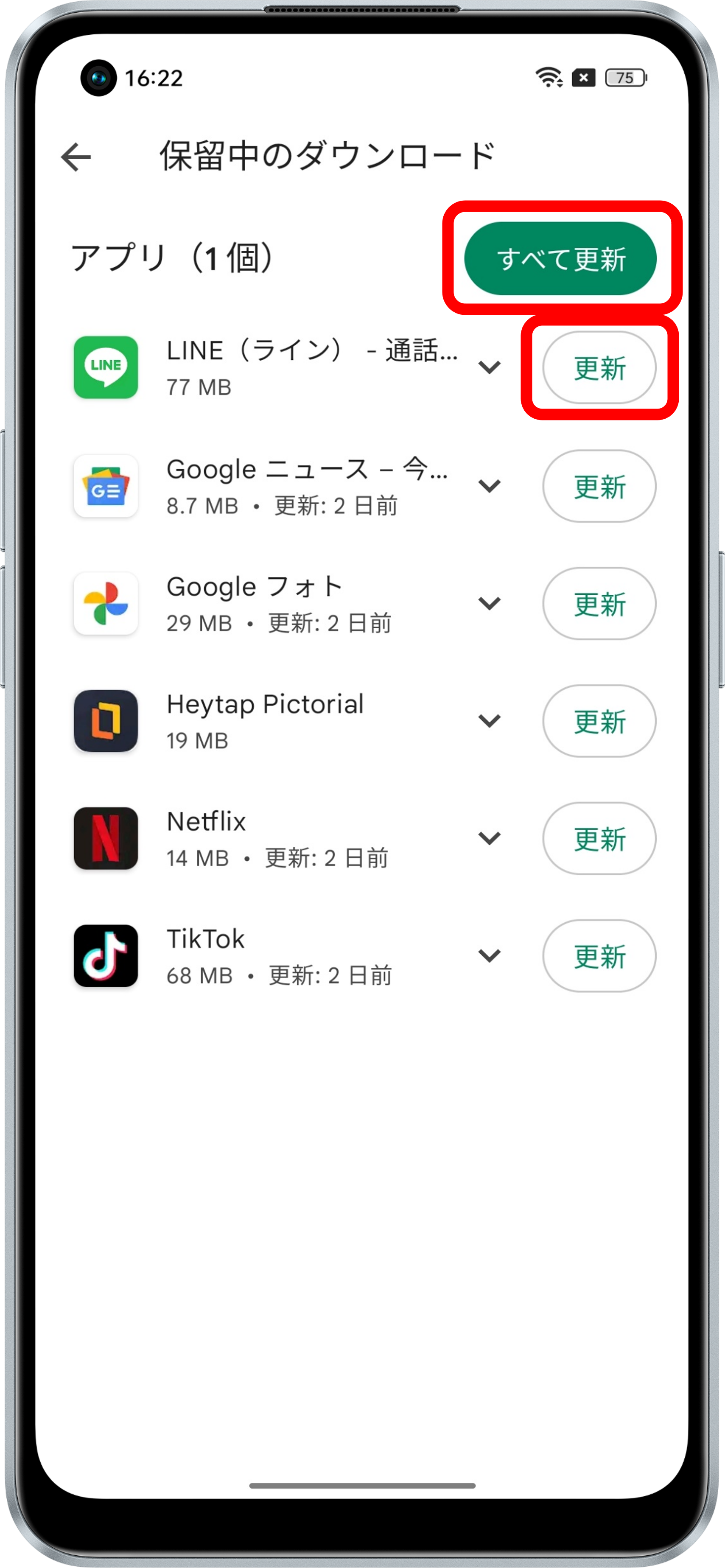 特定のアプリのみ更新したい場合は、該当するアプリの右に表示されている[更新]をタップします。一括で更新する場合は[すべて更新]をタップします。