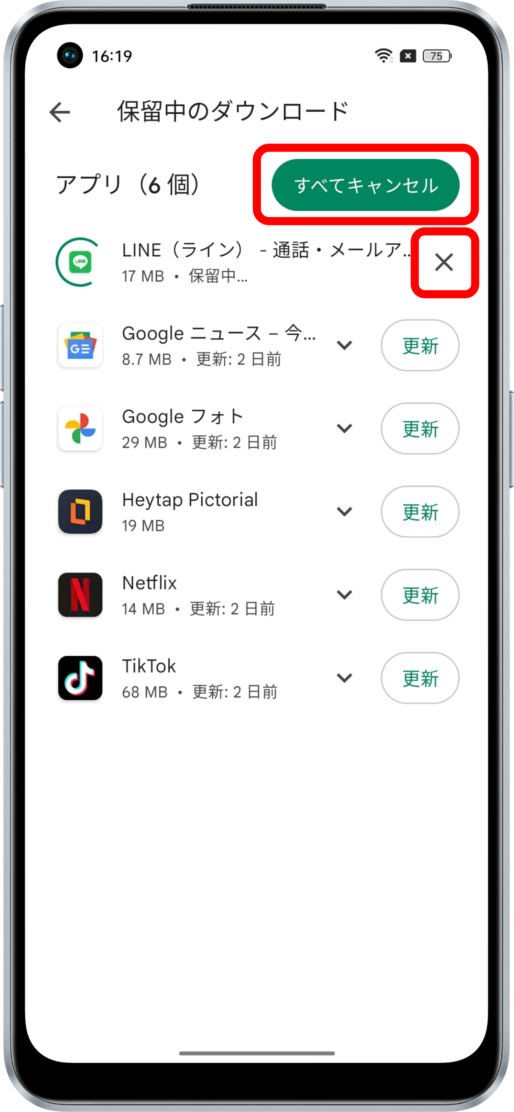 ※更新を開始した後に特定のアプリの更新をキャンセルしたい場合は、更新を止めたいアプリの右に表示されている[✕(バツマーク]をタップします。一括でキャンセルしたい場合は[すべてキャンセル]をタップします。ただし、いずれも更新が完了する前しか操作することができませんのでご注意下さい。
