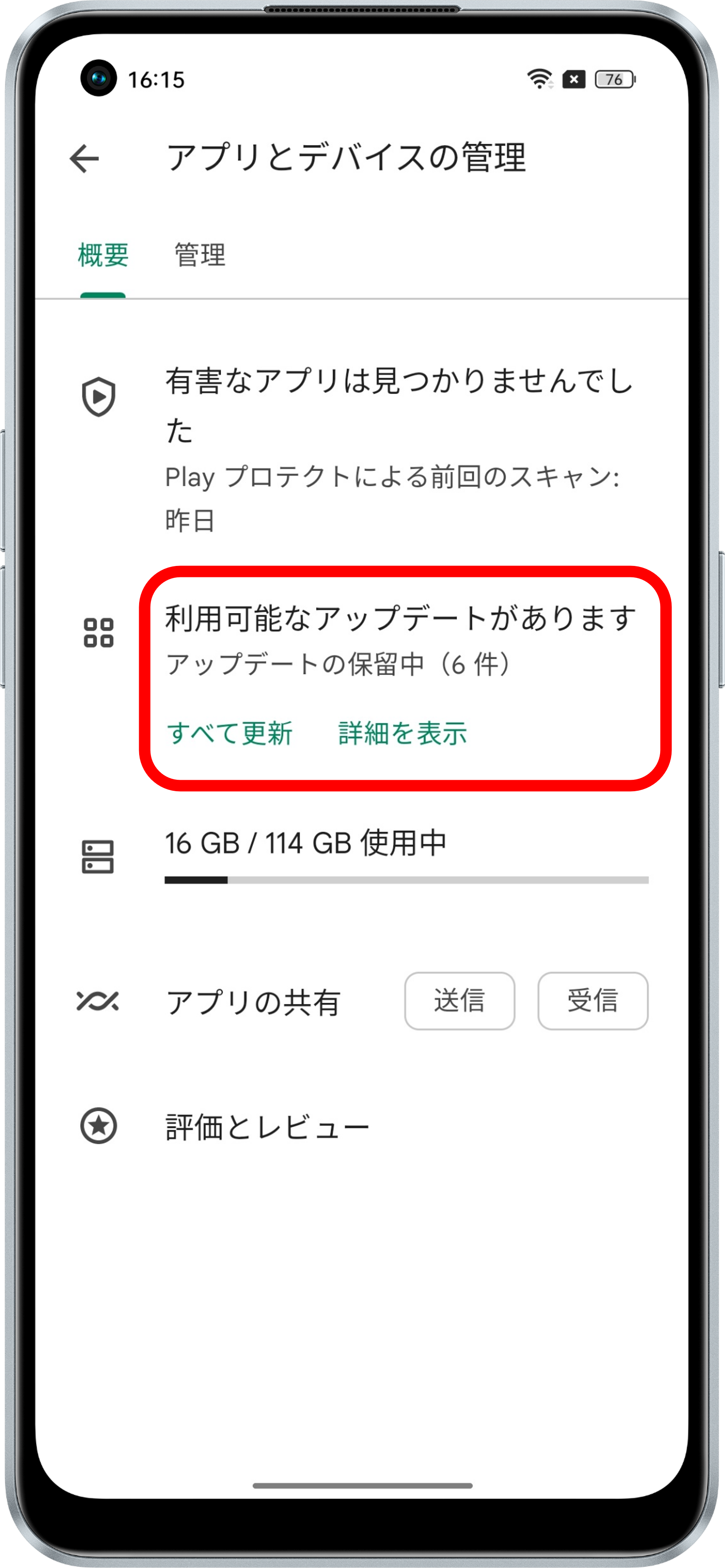 アプリのアップデートはストレージ容量を消費するため、端末に十分なストレージ空き容量があることを確認してください。
