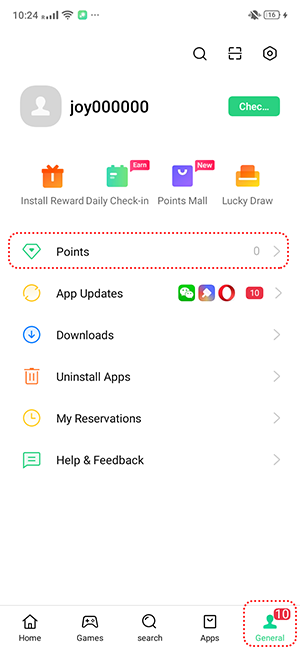 To view your earned points, open [App Market] > [General] > [Points].