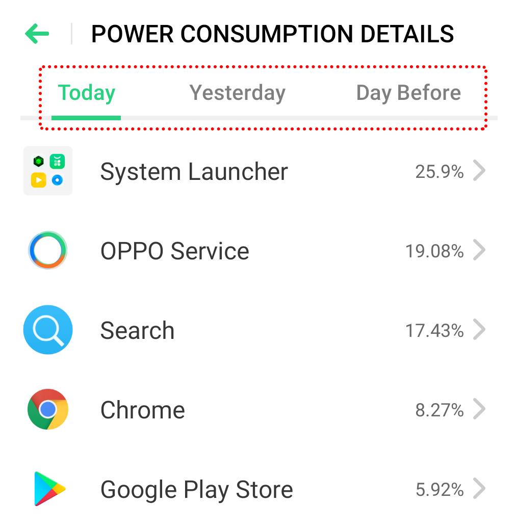 Go to [Settings] > [Battery] > [Power usage]/[POWER CONSUMPTION DETAILS] to view top apps with the highest usage. You can even view the power usage details of the previous 2 days.