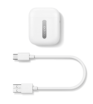 The full charging time for the headphones is 70 minutes and the charging case is 110 minutes. Charging time data is based on OPPO laboratory tests with standard OPPO chargers conducted at a controlled temperature of 25 degrees. Specific times for charging and use will vary according to actual circumstances and charger specifications.