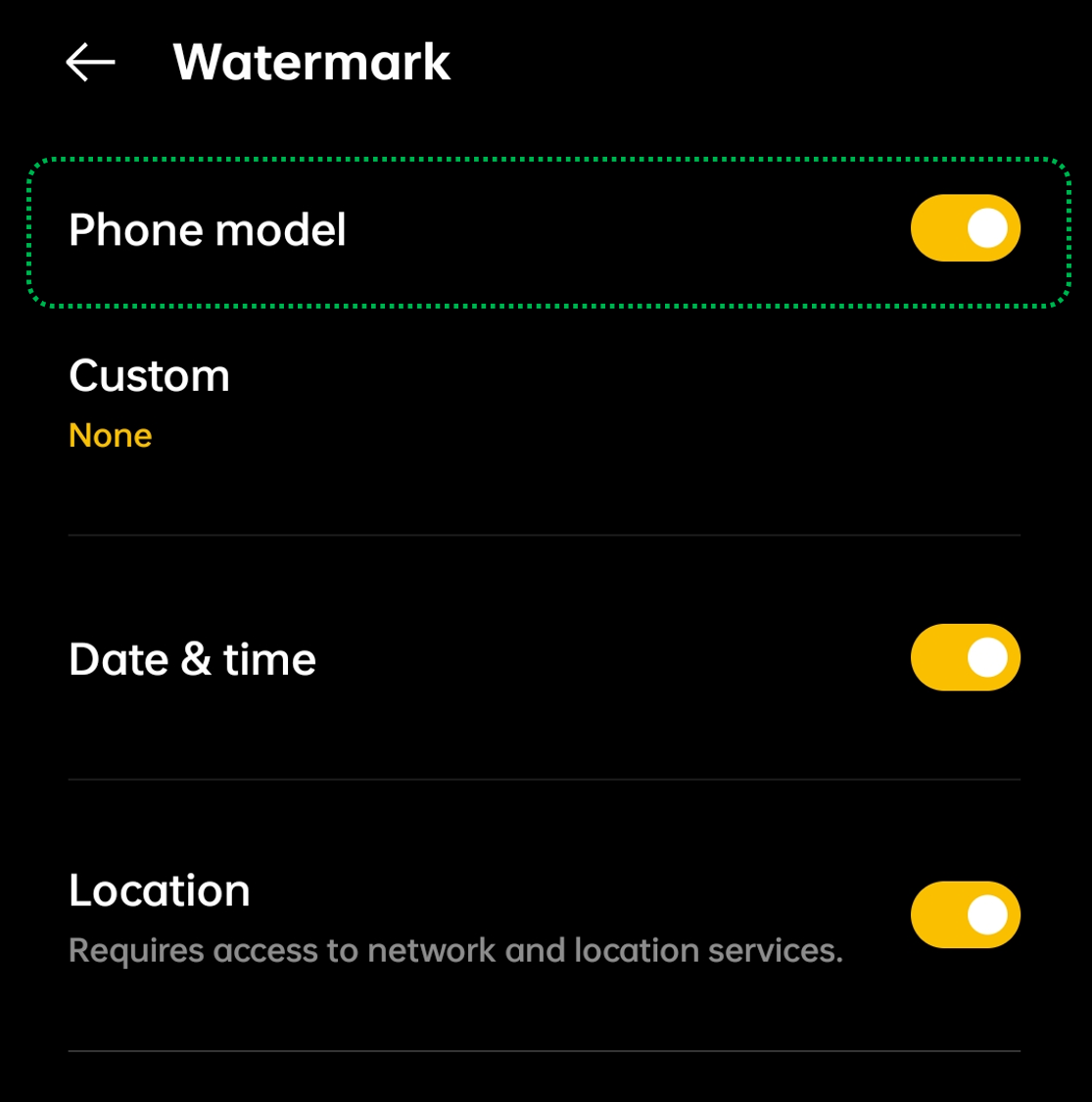 Enable [Phone Model] to add the phone model in the photo, [Custom] to add custom text such as your name.