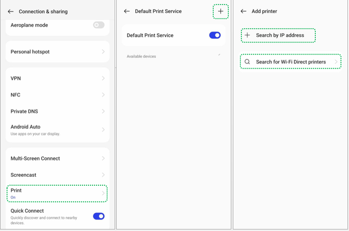 Go to: [Settings] > [Connection & sharing] > [ Print] > [Default Print Service]. In the Upper right Corner Tap [+]. Search by IP address", enter the IP address, and tap [Add] to finish.