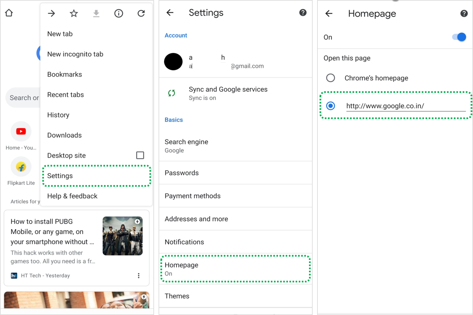 Open [Chrome] > [] > [Settings] > [Homepage] > Enter the website you want to set as the Homepage.