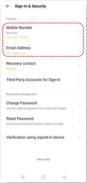 Step2: Tap [Mobile Number] > [Change Phone Number]/[Change email], you would be required to verify via the original mobile number/email.The verification code will be sent to the original mobile number/email. Enter the verification code and tap [Confirm].