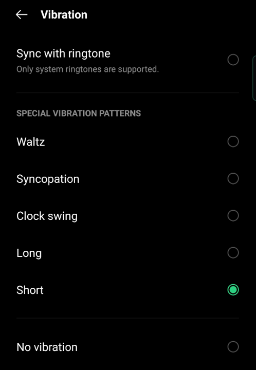 Go to [Settings] > [Sound & Vibration] > [Ringtone] > [Vibration] > Select the Vibration pattern (Sync with ringtone, Waltz, Syncopation, Clock swing, Long, Short, and No vibration).