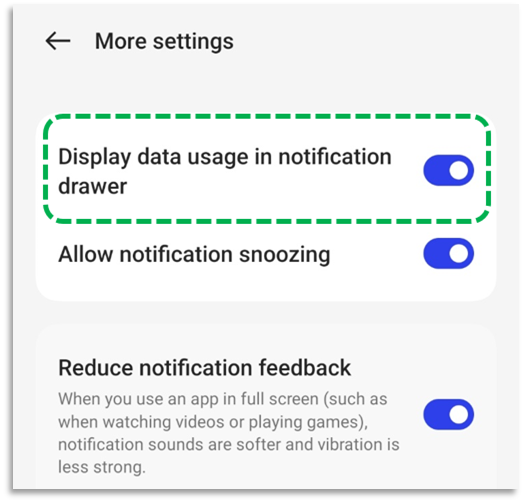Go to [Settings] > Select [Notification & status bar] > [More settings] > Enable [Display data usage in notification drawer].