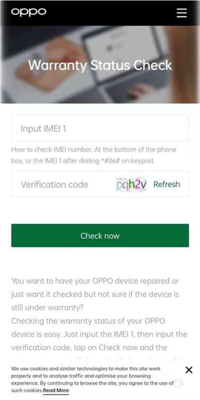 Hover on [Support] > click on the [Warranty Status] > then input your OPPO device's IMEI 1 > Click on [Check Now].